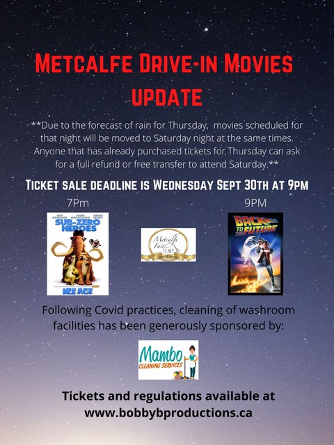 *UPDATE* Due to Thursday’s weather forecast, Metcalfe Fair’s Drive-In Movie Nights are now scheduled for this Friday and Saturday nights, October 2nd and 3rd.